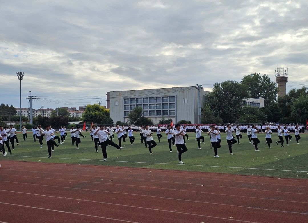 紧接着是充满力量的军体拳表演,拳法刚劲有力,节奏明快。新生们挥拳、踢腿,动作铿锵有力,充分展现了他们的身体素质和训练成果。军体拳不仅是体能的展示,更象征着一种坚韧不拔、勇敢迎战的精神。
